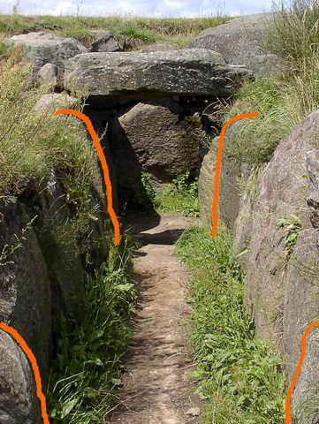 Es ist bei diesen Grundrissen leicht zu bemerken, dass sie einem Formtypus folgen, der dem Uterus und dem Geburtskanal gleicht. Die Pfeile geben die Nordrichtung an. Der Gang weist also überwiegend nach Osten. Bei einer Nutzung als Grab, gliche der Weg zurück in die Welt der Verstorbenen, einer Geburt in die geistige Welt hinein. (“Wenn ein Mensch stirbt, wird er Geist. Wenn ein Geist stirbt, wird er Mensch“, Novalis). Bei einer Nutzung als Einweihungsstätte wären die in der Zeichnung dargestellten, liegenden "Schwellensteine" von Bedeutung. In Tustrup liegt die Besonderheit vor, dass die Schwellensteine nicht liegend, sondern stehend eingebaut sind und dass es gleich zwei Paar davon gibt (siehe folgendes Bild).
